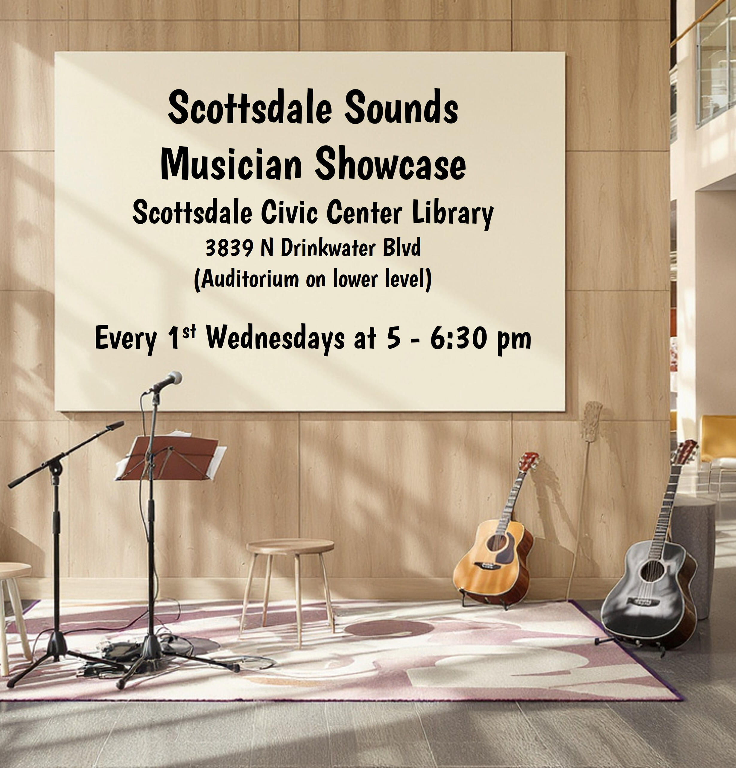 Scottsdale Sounds is a free, community music series sponsored by the Scottsdale Public Library and proudly hosted by Dave Manley. Local musicians generously volunteer their time, creating a welcoming space to share talent and enjoy live music.The series takes place monthly on the first Wednesday at the Civic Center Branch from 5:00–6:30 pm in the auditorium, and monthly on Thursdays at the Arabian Branch patio under the stars during cooler months.For more information or to reserve a performance spot, please contact me!