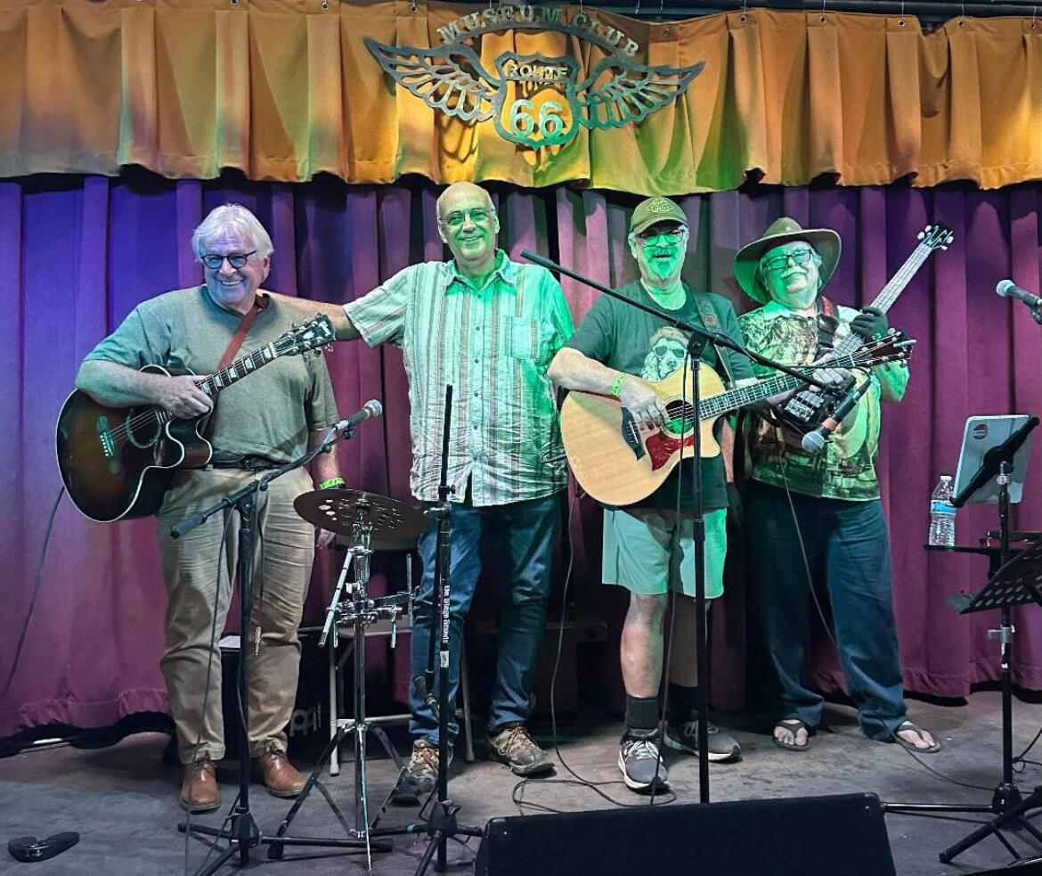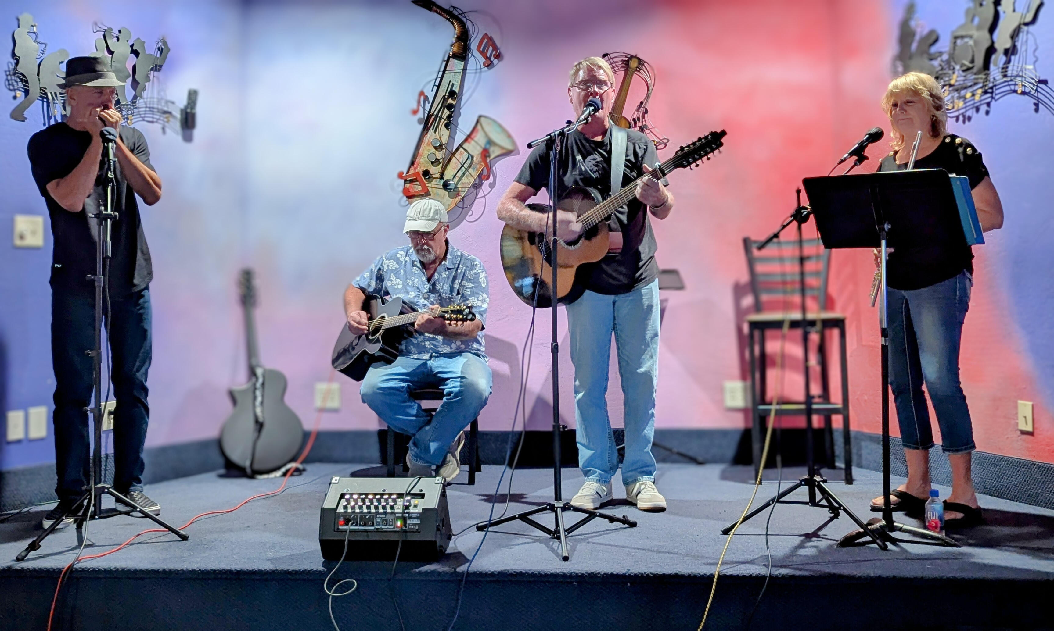Long-John Jukebox is an eclectic band featuring Doug Long on lead acoustic guitar, John Diggs on acoustic guitar and vocals, Susan Schlappi on flute and vocals, and Eddie Jay on harmonica. With 60 years of musical experience each, Doug, John, and Susan have performed in bands across Phoenix, LA, and Shanghai. Eddie Jay, a mainstay in the local blues scene, rounds out the group. Together, they deliver a passionate mix of rock, country, folk, and blues tunes, captivating audiences with their seasoned and heartfelt performances.